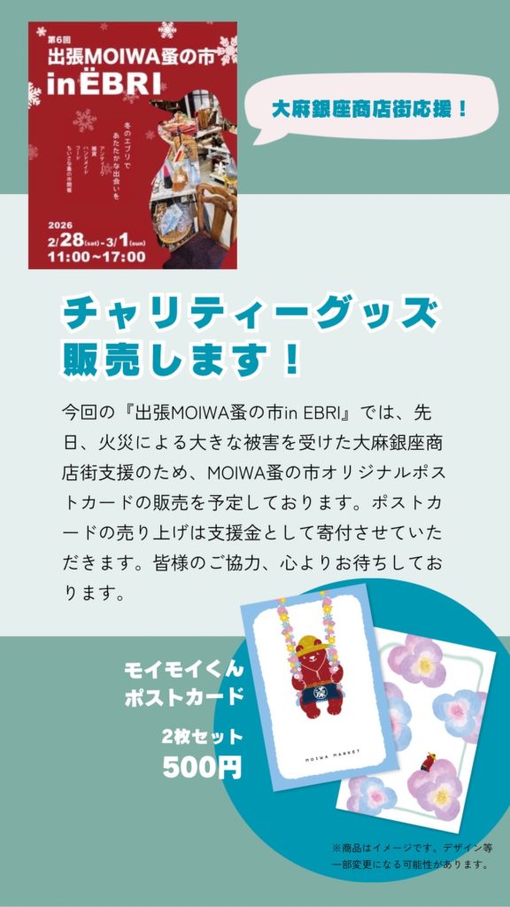 そこで今回の「出張MOIWA蚤の市 in EBRI」では、商店街支援のために チャリティーポストカード を販売します。
